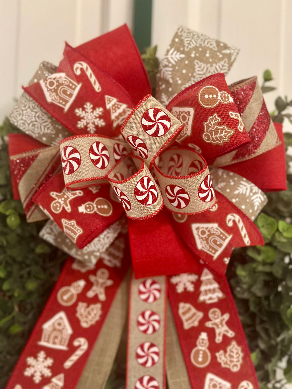 Here is another fun gingerbread themed Christmas bow. We made this bow from seven (7) wired ribbons, featuring, of course, gingerbread cookies, Christmas trees, snowflakes, snowmen and bells. Also, the central ribbon has red and white peppermints, and a wide beige ribbon in the background has ornate snowflakes print.